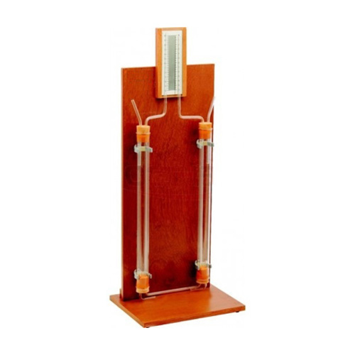 The lower ends of the tubes are bent & are connected horizontally. The upper open ends of the vertical limbs are bent so as to be placed side by side against a silvered glass scale 0-12 cm figured every 2 cm. The whole apparatus is mounted on a wooden stand by means of spring clips. All the glass parts are easily removable, used in determination of coefficient of absolute expansion of mercury.