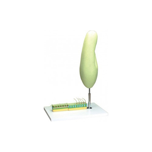 Paramecium, enlarged approx. 1600 times, showing the cell inventory of a protozoa: macro and micronucleus, contractile vacuoles, cytostome with membranellae, myonemes and food vacuoles and the formation of the endo and ectoplasm and the network of neuronemes, it also shows the structure of the pellicle of the ectoplasm, and the position and order of the trichocysts and a range of cilia in typical order, mounted on base with key card.
